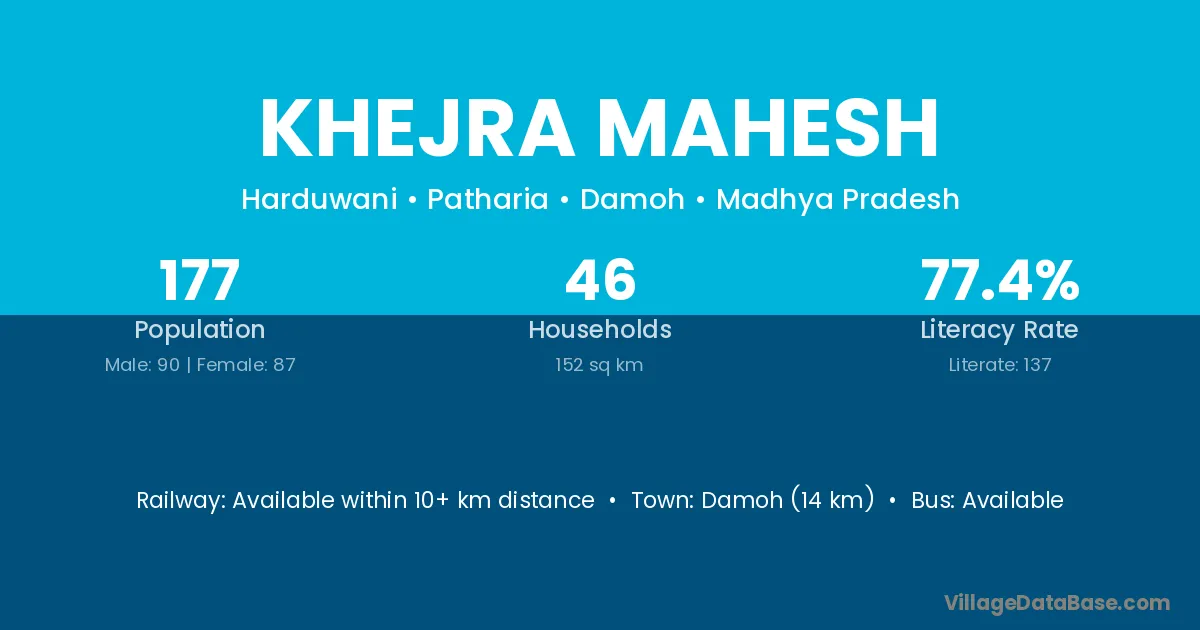 Damoh (14 km) is the nearest town to Khejra Mahesh village for major economic activities and is located approximately 14 km away.