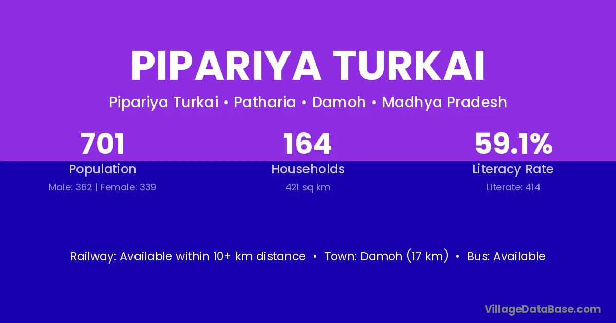 Damoh (17 km) is the nearest town to Pipariya Turkai village for major economic activities and is located approximately 17 km away.
