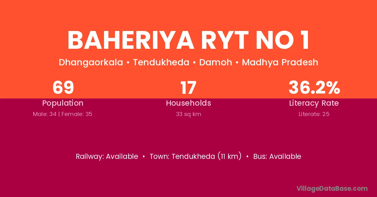 Tendukheda (11 km) is the nearest town to Baheriya Ryt No 1 village for major economic activities and is located approximately 11 km away.