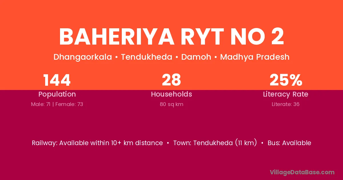 Tendukheda (11 km) is the nearest town to Baheriya Ryt No 2 village for major economic activities and is located approximately 11 km away.