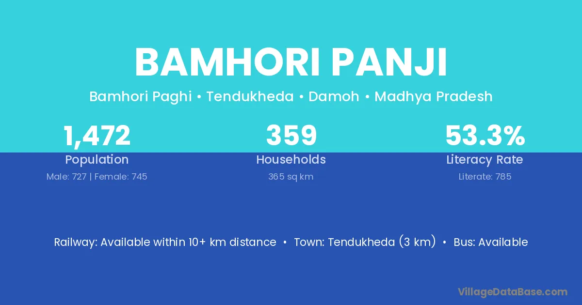 Tendukheda (3 km) is the nearest town to Bamhori Panji village for major economic activities and is located approximately 3 km away.