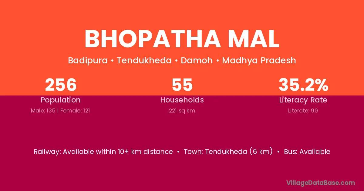 Bhopatha Mal village has a total population of 256 people, of which 135 are males and 121 are females.