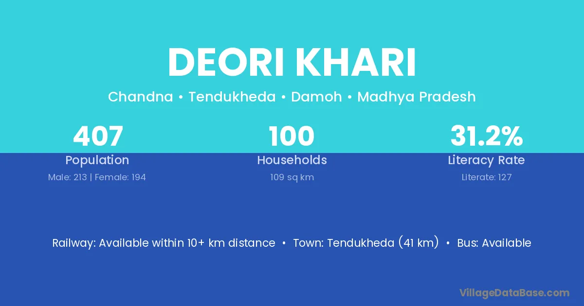 Tendukheda (41 km) is the nearest town to Deori Khari village for major economic activities and is located approximately 41 km away.