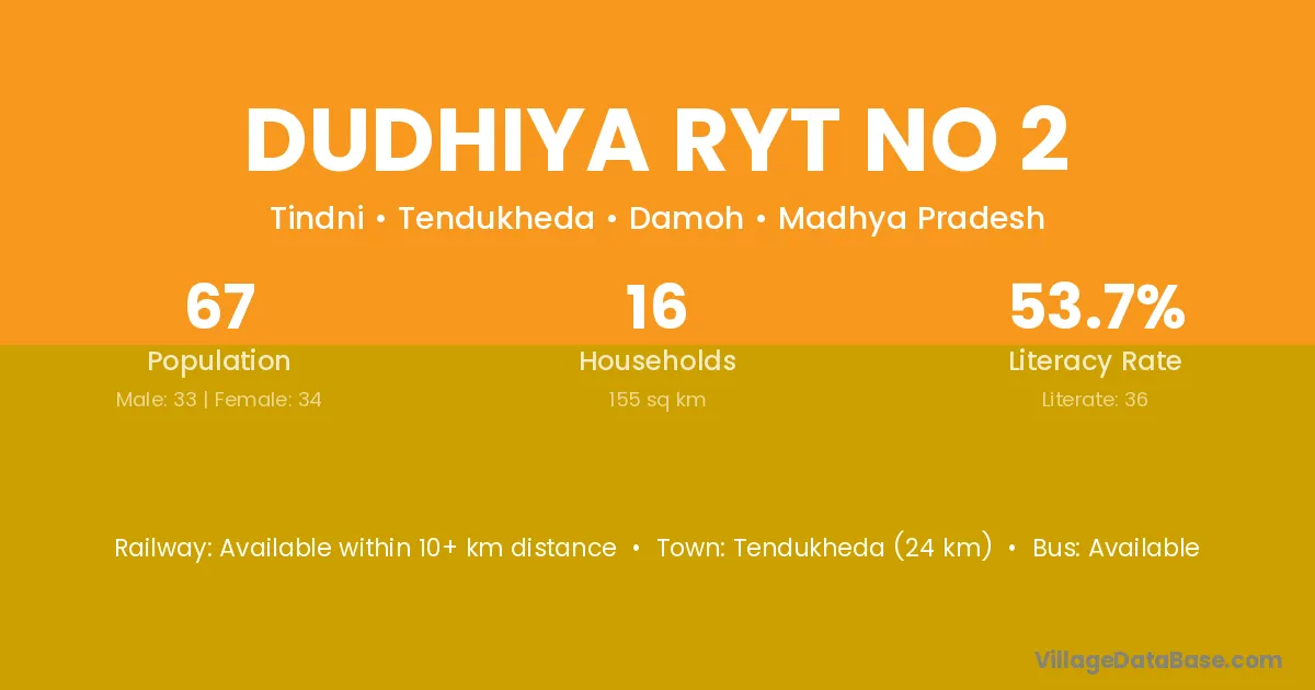 Tendukheda (24 km) is the nearest town to Dudhiya Ryt No 2 village for major economic activities and is located approximately 24 km away.