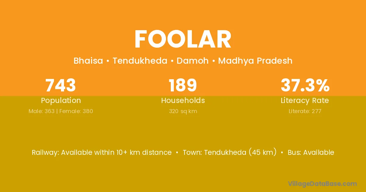 Tendukheda (45 km) is the nearest town to Foolar village for major economic activities and is located approximately 45 km away.