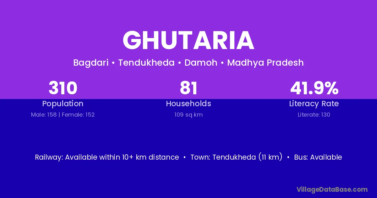 Tendukheda (11 km) is the nearest town to Ghutaria village for major economic activities and is located approximately 11 km away.