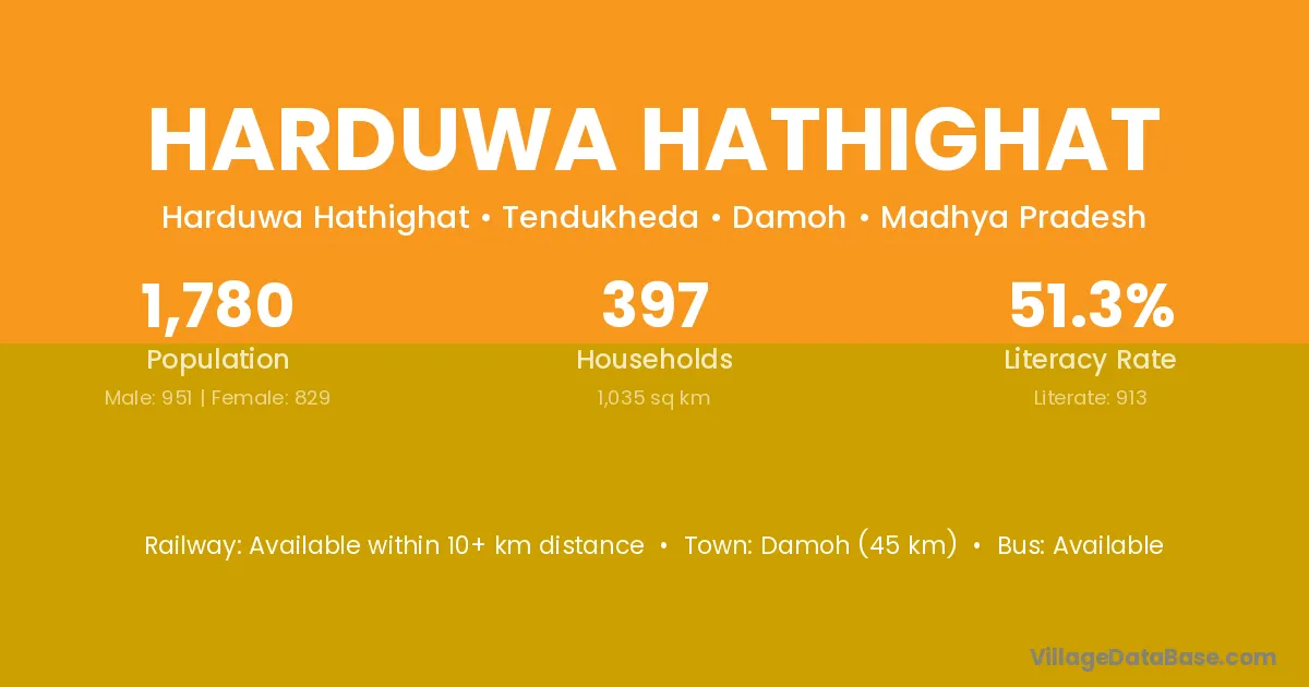 Damoh (45 km) is the nearest town to Harduwa Hathighat village for major economic activities and is located approximately 45 km away.