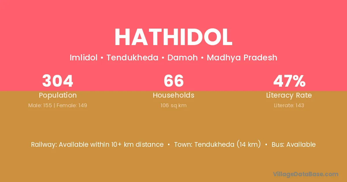 Tendukheda (14 km) is the nearest town to Hathidol village for major economic activities and is located approximately 14 km away.