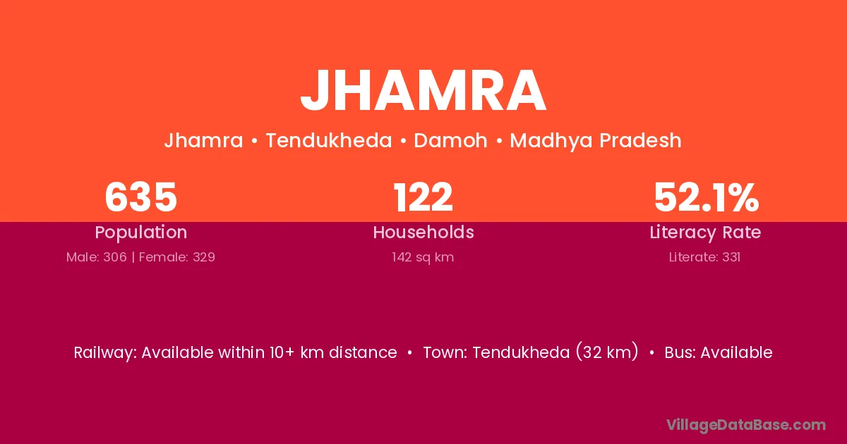 Tendukheda (32 km) is the nearest town to Jhamra village for major economic activities and is located approximately 32 km away.