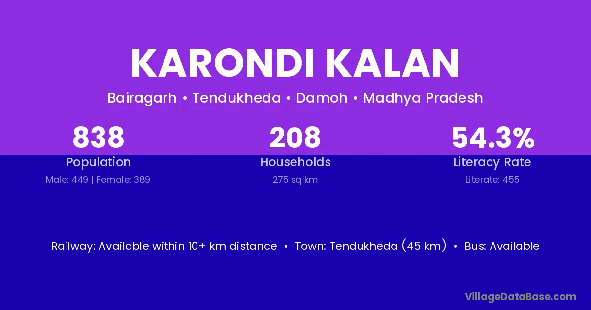 Tendukheda (45 km) is the nearest town to Karondi Kalan village for major economic activities and is located approximately 45 km away.