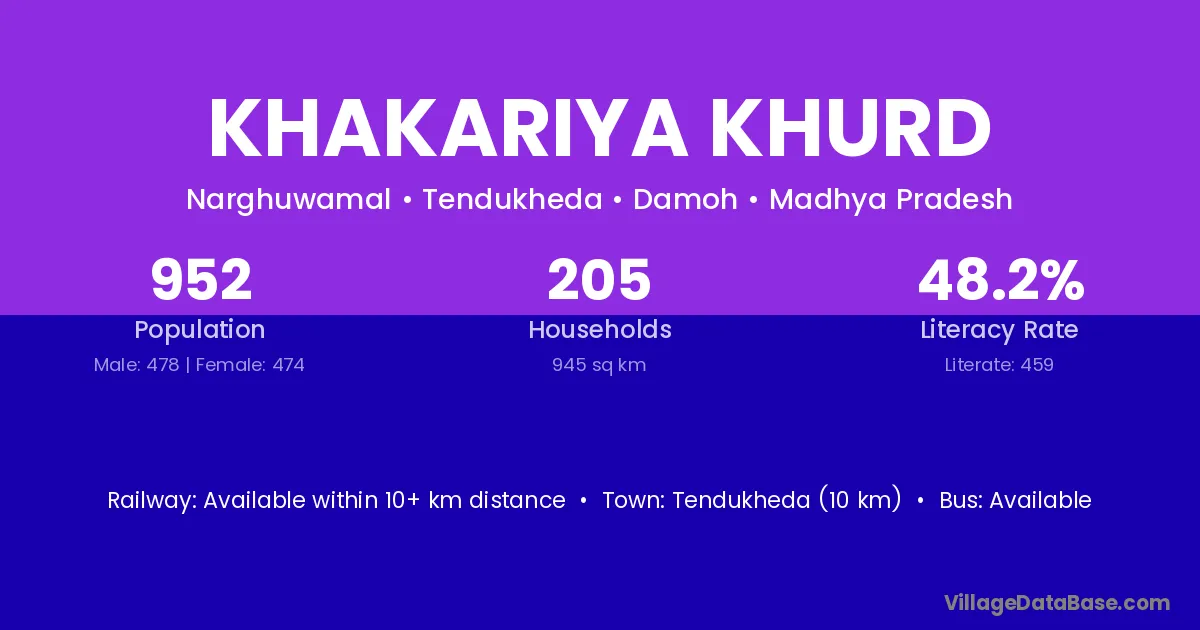 Khakariya Khurd village has a total population of 952 people, of which 478 are males and 474 are females.