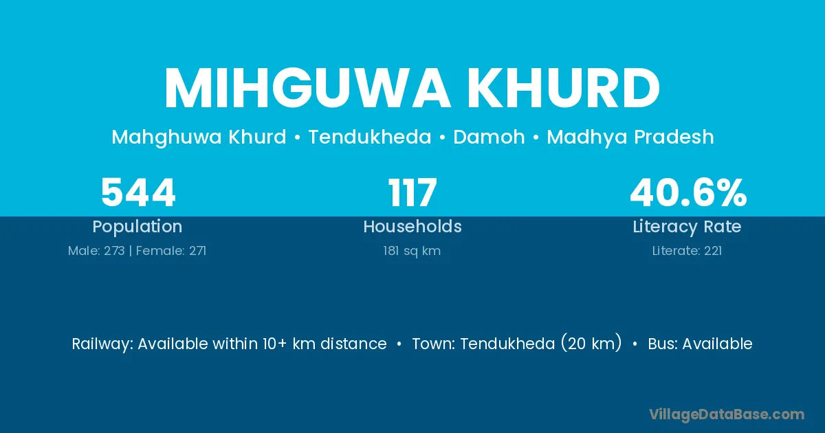 Tendukheda (20 km) is the nearest town to Mihguwa Khurd village for major economic activities and is located approximately 20 km away.