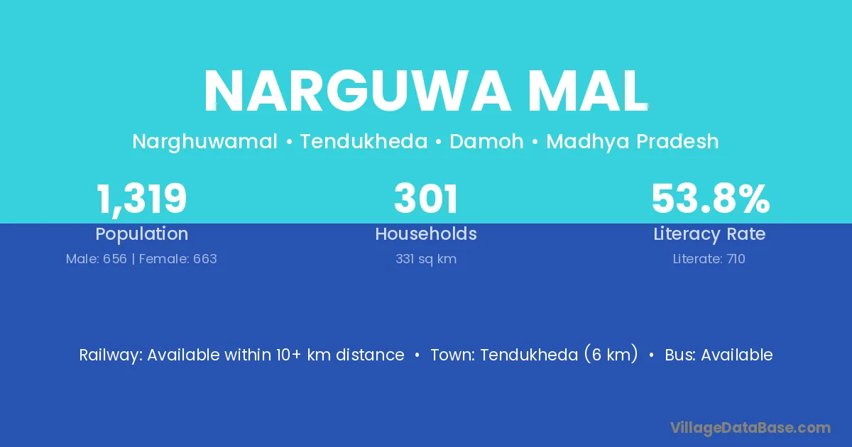 Tendukheda (6 km) is the nearest town to Narguwa Mal village for major economic activities and is located approximately 6 km away.
