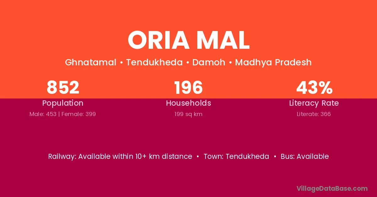 Oria Mal village has a total population of 852 people, of which 453 are males and 399 are females.