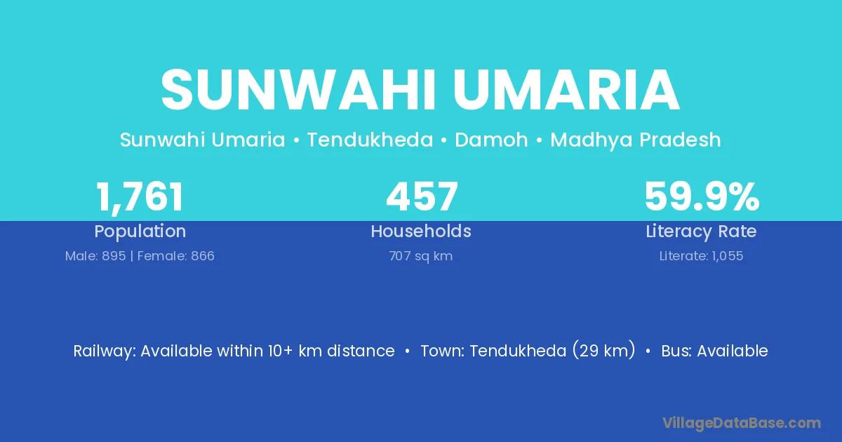 Tendukheda (29 km) is the nearest town to Sunwahi Umaria village for major economic activities and is located approximately 29 km away.