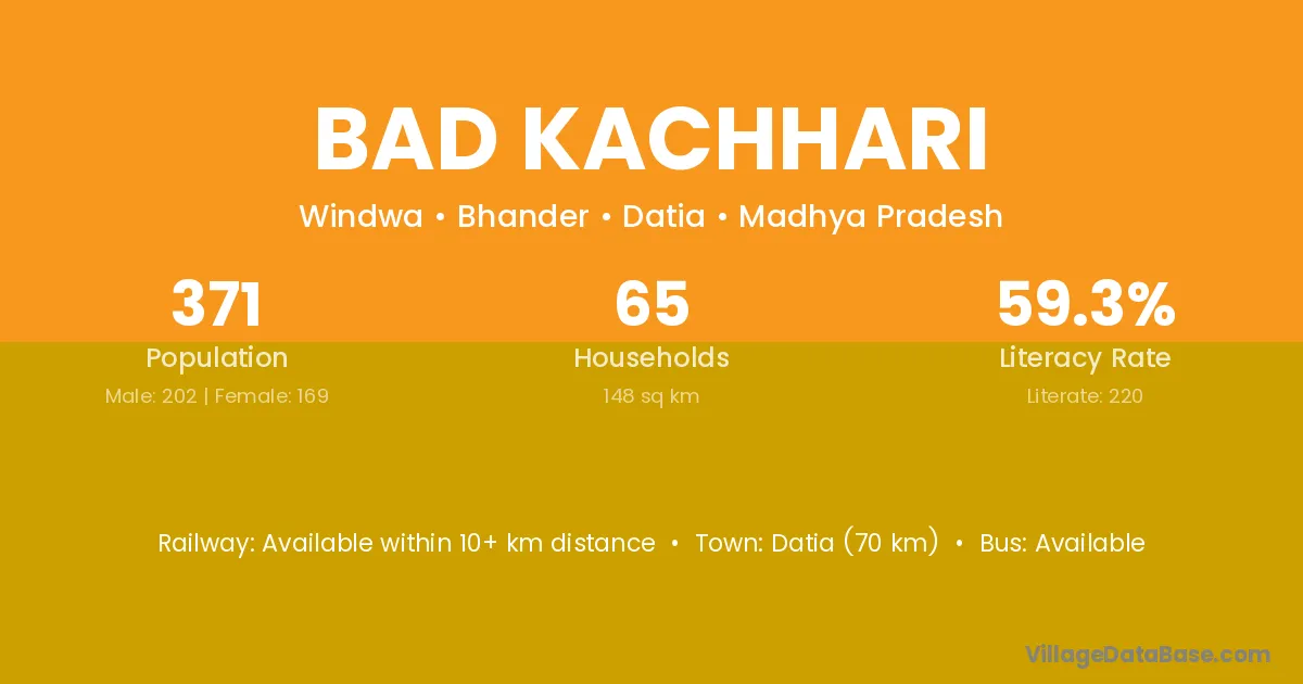 Datia (70 km) is the nearest town to Bad Kachhari village for major economic activities and is located approximately 70 km away.
