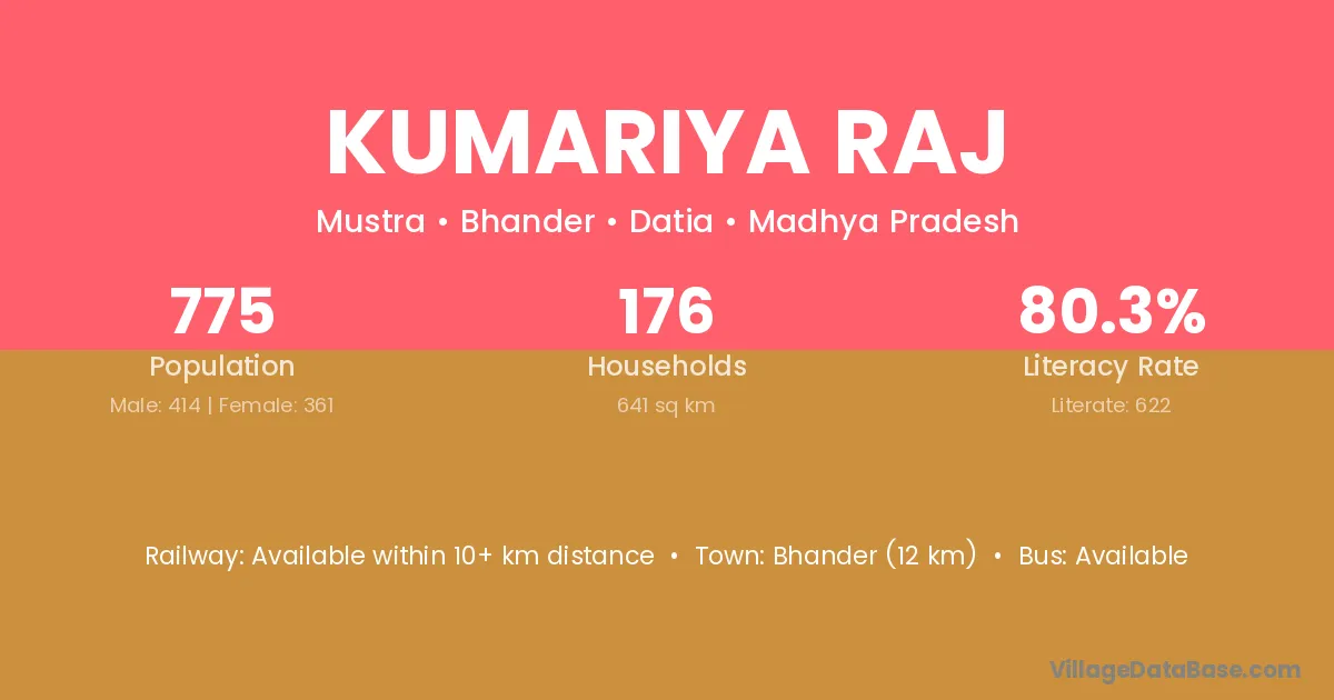 Bhander (12 km) is the nearest town to Kumariya Raj village for major economic activities and is located approximately 12 km away.