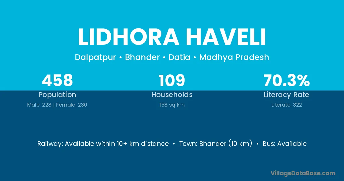 Lidhora Haveli village has a total population of 458 people, of which 228 are males and 230 are females.