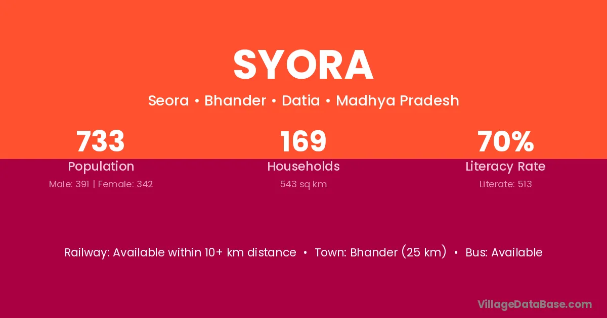Bhander (25 km) is the nearest town to Syora village for major economic activities and is located approximately 25 km away.