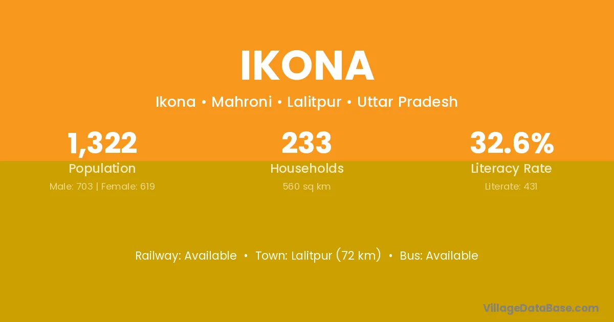 The literacy rate of Ikona village is 60.24%. Male literacy stands at 72.03% and female literacy at 46.22%.