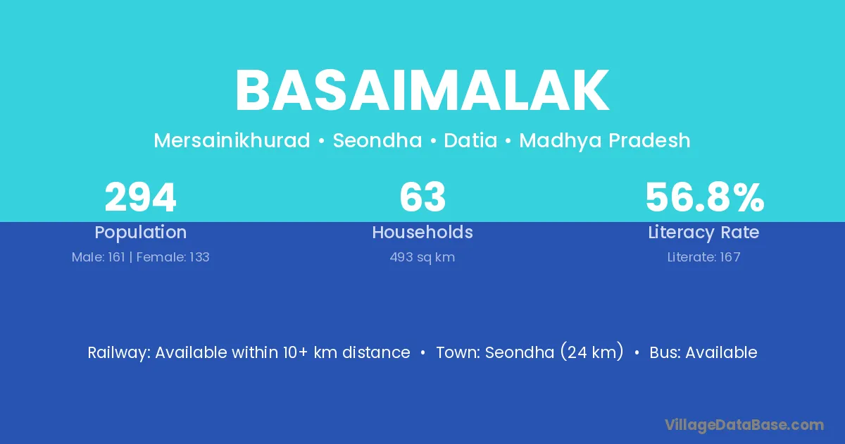 Seondha (24 km) is the nearest town to Basaimalak village for major economic activities and is located approximately 24 km away.