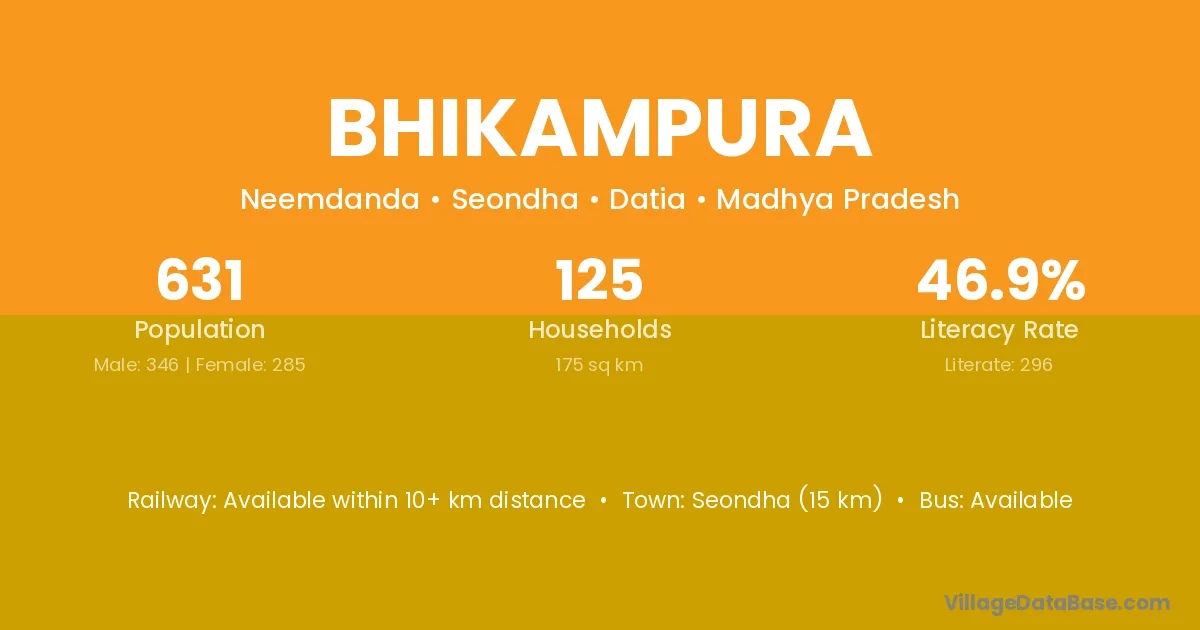 Seondha (15 km) is the nearest town to Bhikampura village for major economic activities and is located approximately 15 km away.