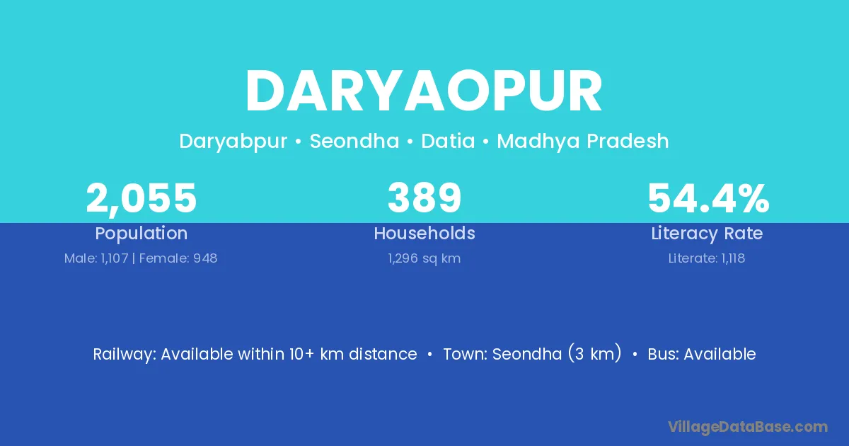 Seondha (3 km) is the nearest town to Daryaopur village for major economic activities and is located approximately 3 km away.