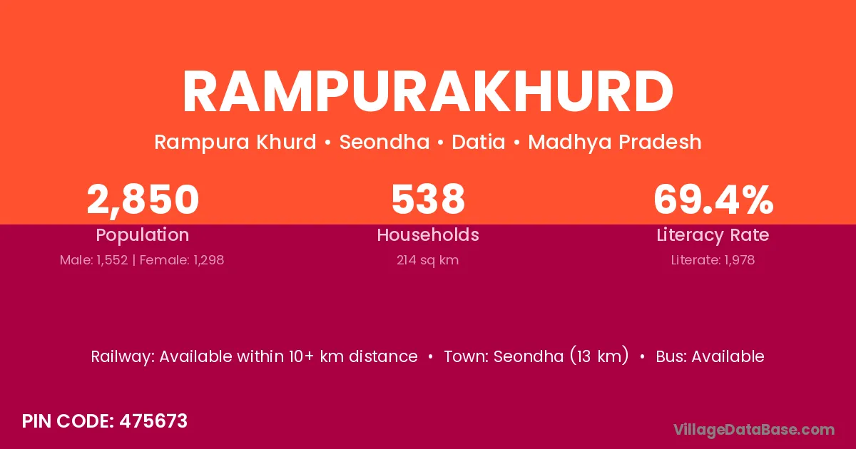 Seondha (13 km) is the nearest town to Rampurakhurd village for major economic activities and is located approximately 13 km away.