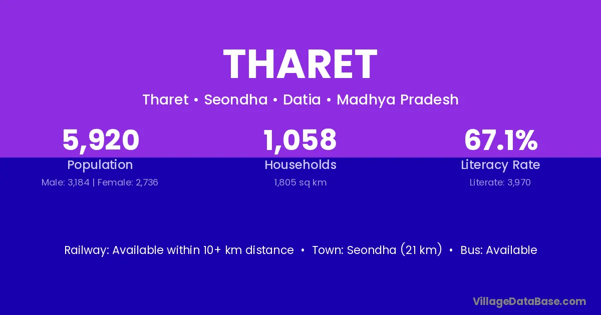 Seondha (21 km) is the nearest town to Tharet village for major economic activities and is located approximately 21 km away.