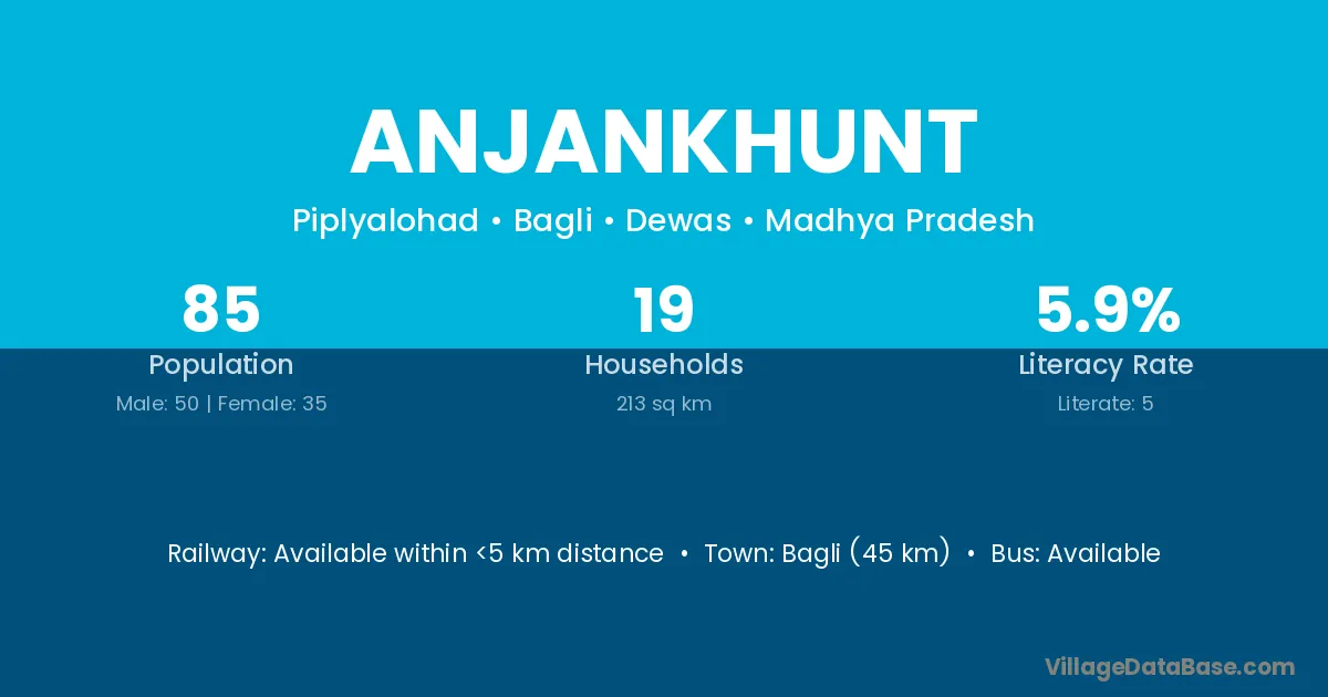 Bagli (45 km) is the nearest town to Anjankhunt village for major economic activities and is located approximately 45 km away.