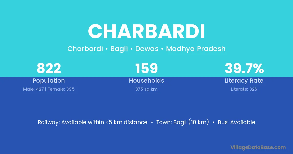 Bagli (10 km) is the nearest town to Charbardi village for major economic activities and is located approximately 10 km away.