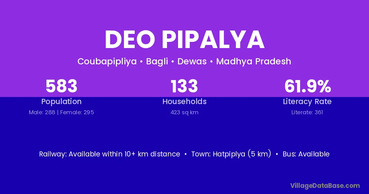 Deo Pipalya village has a total population of 583 people, of which 288 are males and 295 are females.