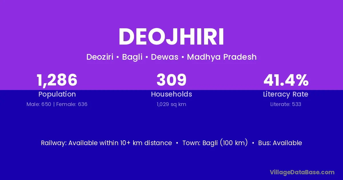 Bagli (100 km) is the nearest town to Deojhiri village for major economic activities and is located approximately 100 km away.