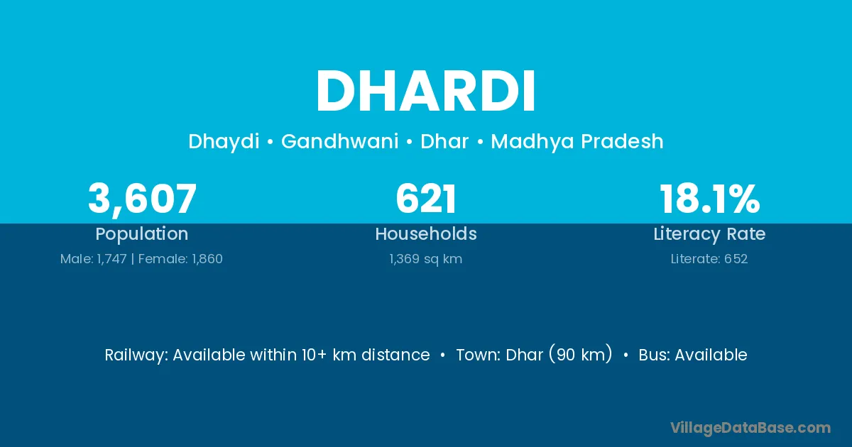 Bagli (65 km) is the nearest town to Dhardi village for major economic activities and is located approximately 65 km away.