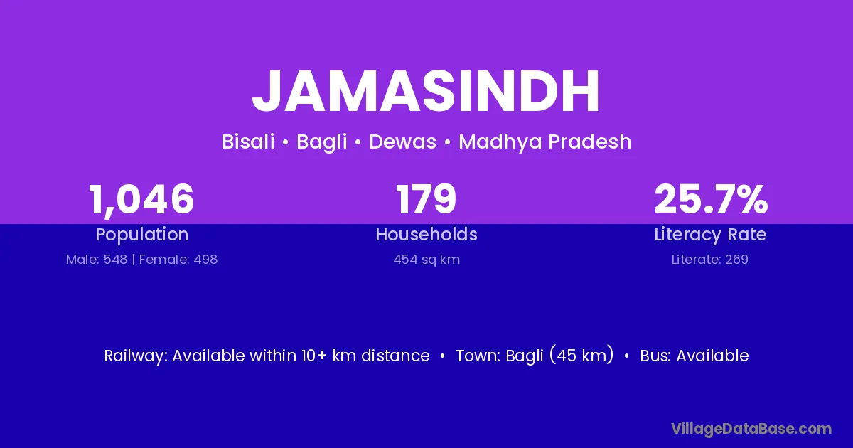 Bagli (45 km) is the nearest town to Jamasindh village for major economic activities and is located approximately 45 km away.