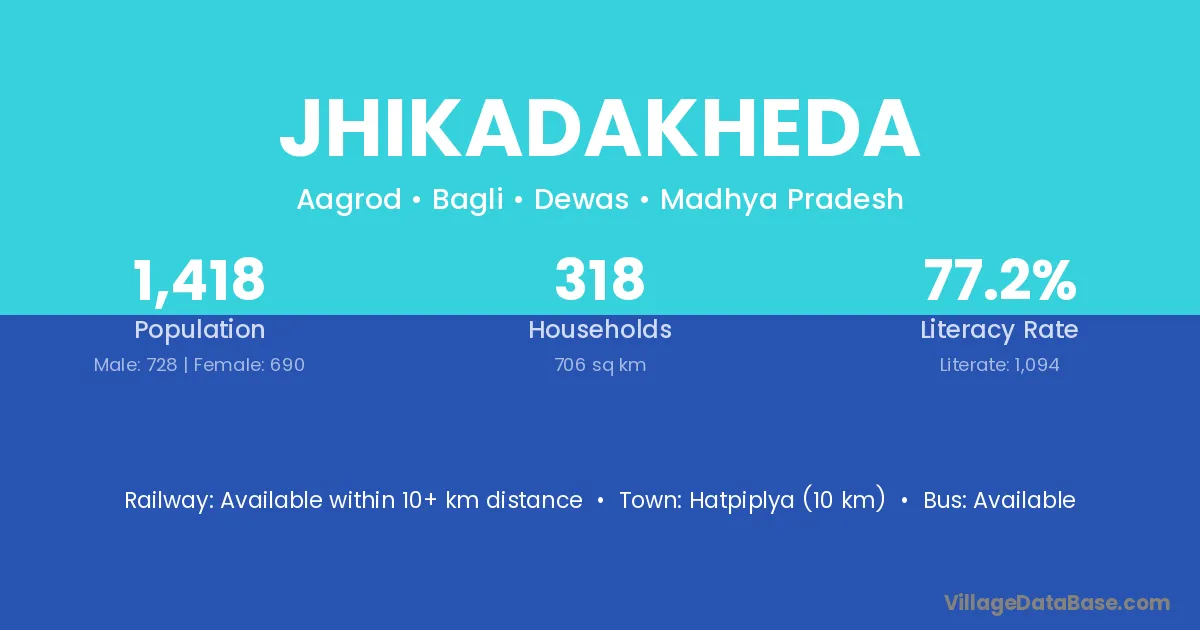 Jhikadakheda village has a total population of 1,418 people, of which 728 are males and 690 are females.
