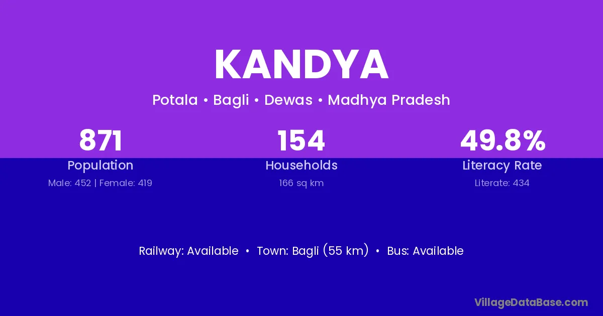 Bagli (55 km) is the nearest town to Kandya village for major economic activities and is located approximately 55 km away.
