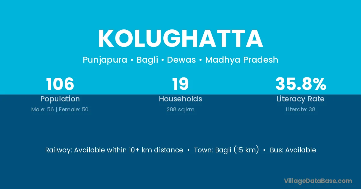 Bagli (15 km) is the nearest town to Kolughatta village for major economic activities and is located approximately 15 km away.