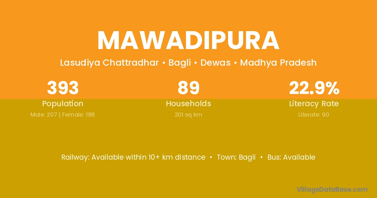 Mawadipura village has a total population of 393 people, of which 207 are males and 186 are females.