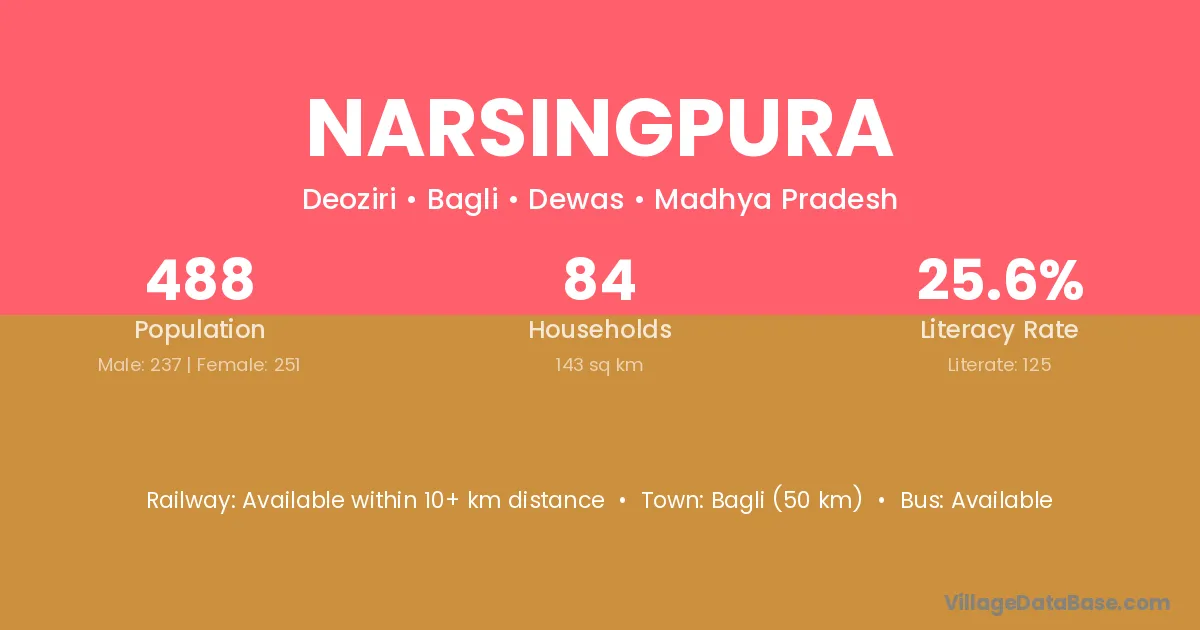 Bagli (50 km) is the nearest town to Narsingpura village for major economic activities and is located approximately 50 km away.