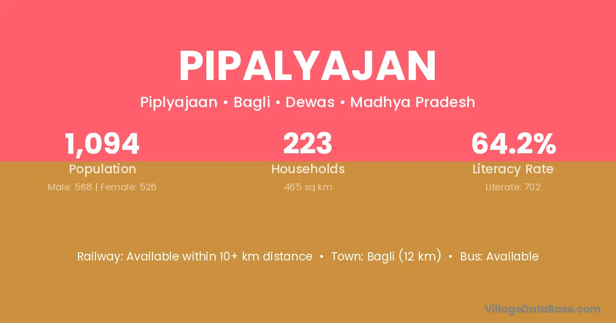 Bagli (12 km) is the nearest town to Pipalyajan village for major economic activities and is located approximately 12 km away.
