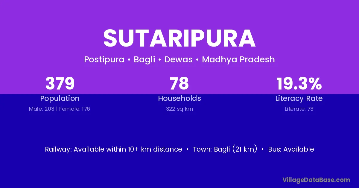Bagli (21 km) is the nearest town to Sutaripura village for major economic activities and is located approximately 21 km away.