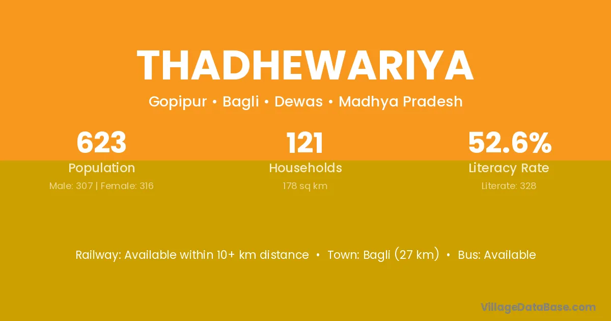 Bagli (27 km) is the nearest town to Thadhewariya village for major economic activities and is located approximately 27 km away.