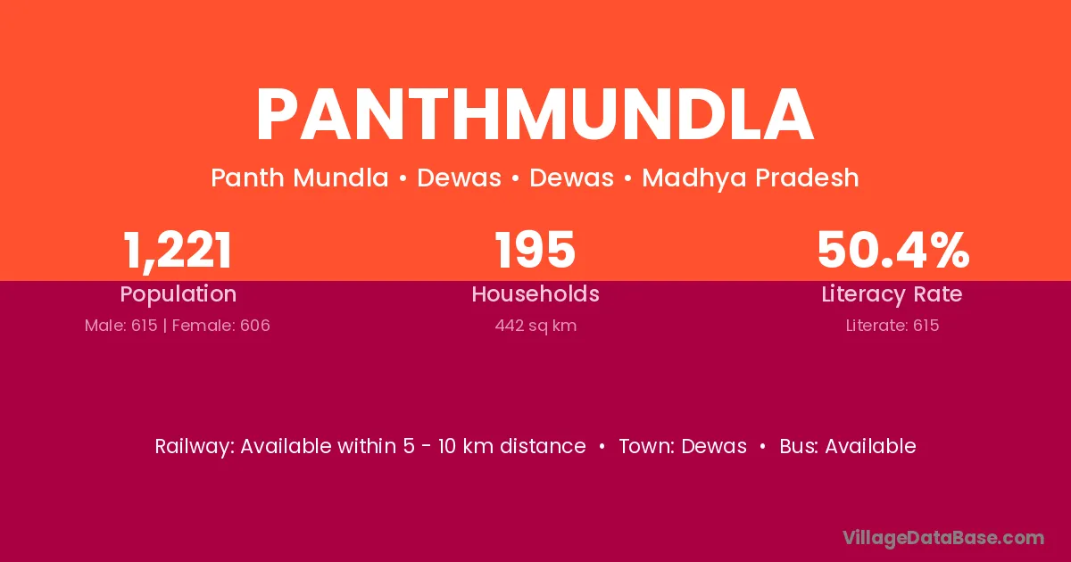 Panthmundla village has a total population of 1,221 people, of which 615 are males and 606 are females.