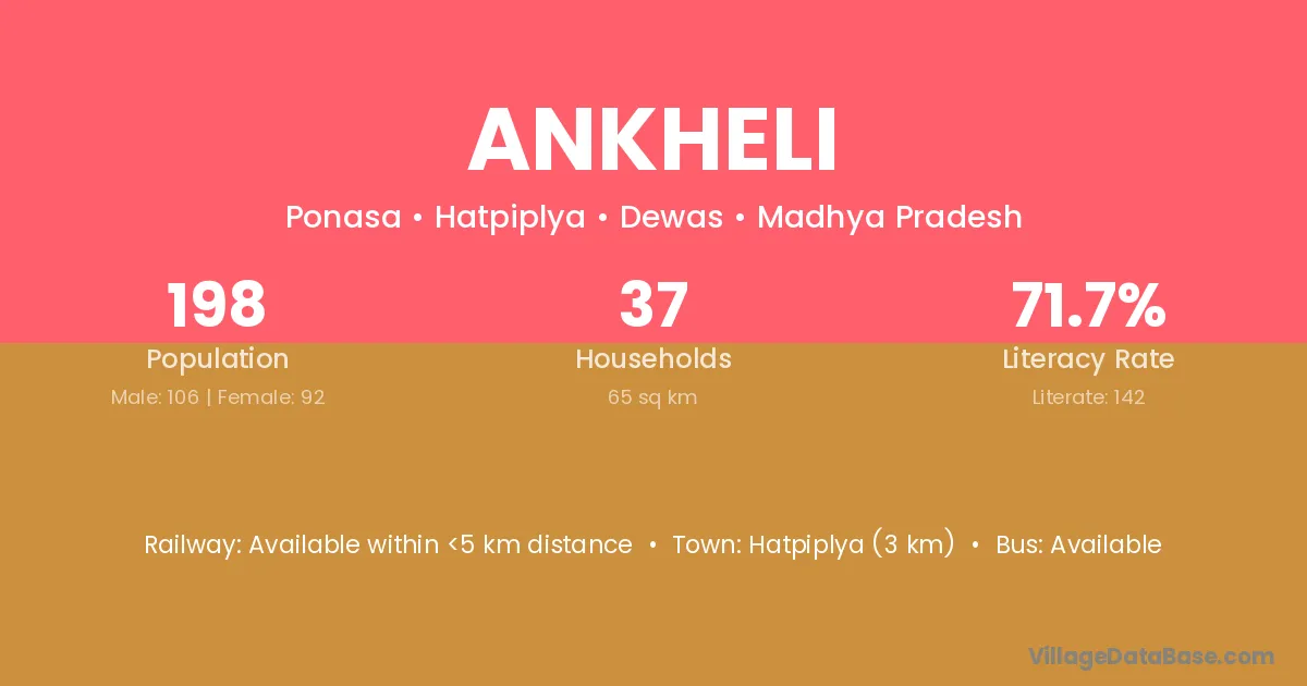 Hatpiplya (3 km) is the nearest town to Ankheli village for major economic activities and is located approximately 3 km away.
