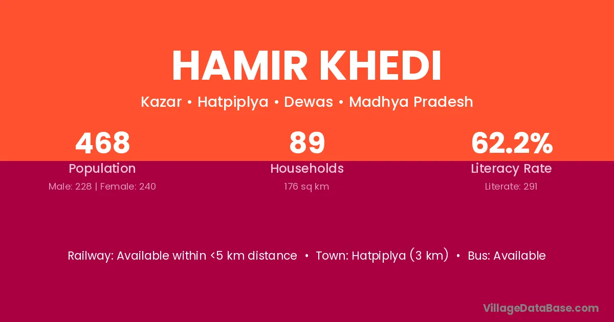 Hatpiplya (3 km) is the nearest town to Hamir Khedi village for major economic activities and is located approximately 3 km away.