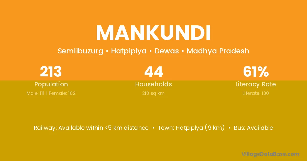 Mankundi village has a total population of 213 people, of which 111 are males and 102 are females.