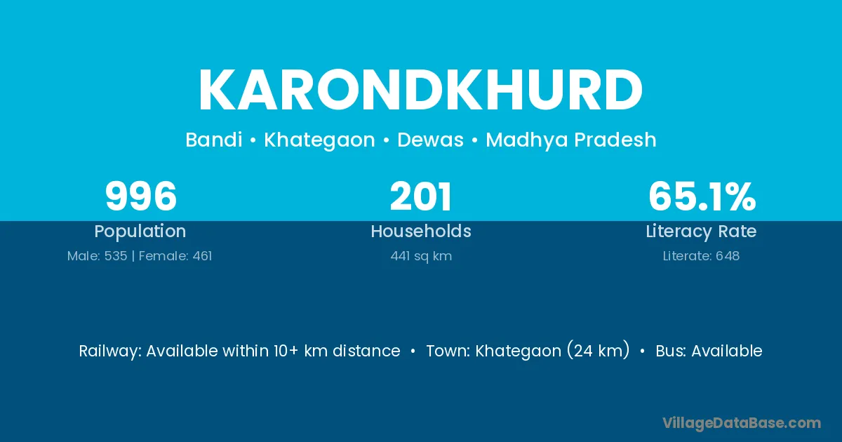 Khategaon (24 km) is the nearest town to Karondkhurd village for major economic activities and is located approximately 24 km away.
