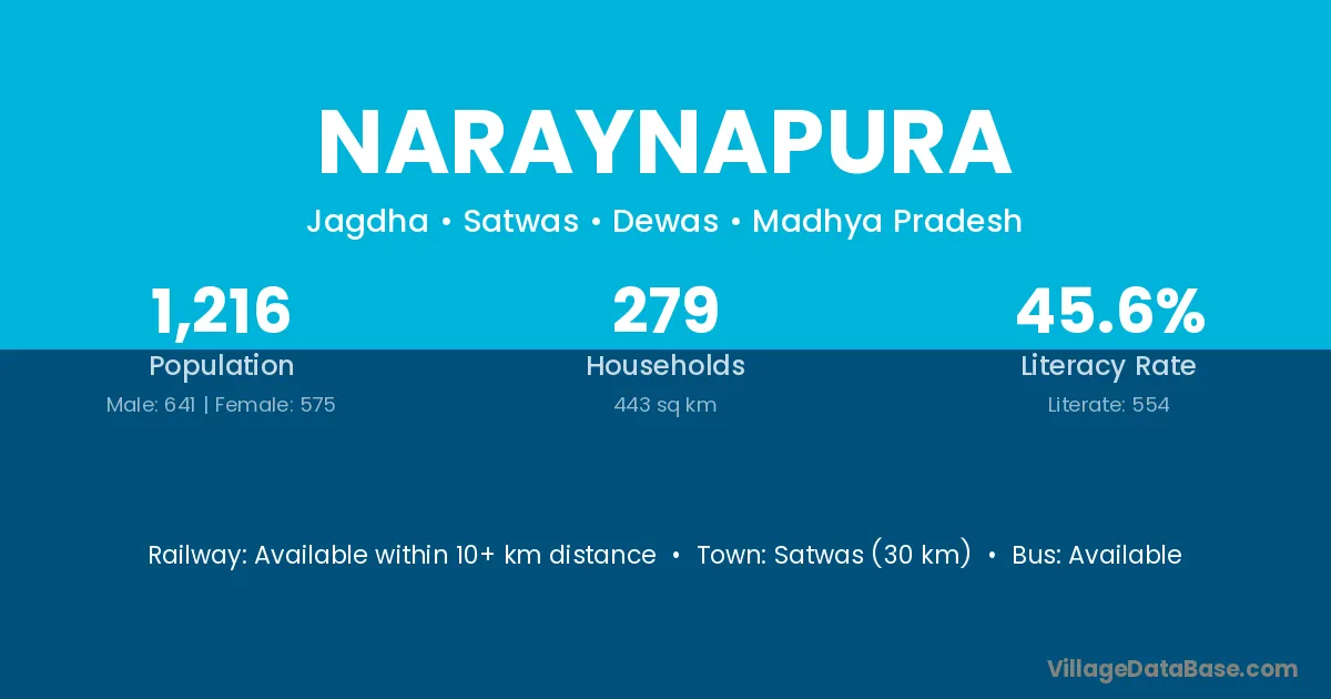Satwas (30 km) is the nearest town to Naraynapura village for major economic activities and is located approximately 30 km away.