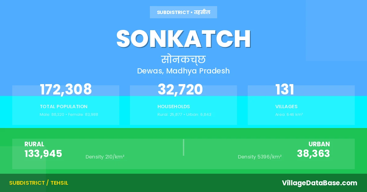 According to the 2011 census The total area of Sonkatch Tehsil is 646 km², with a population of 172308 people. The population density is 267 inhabitants per square kilometre, and there are approximately 32720 houses in the sub district.